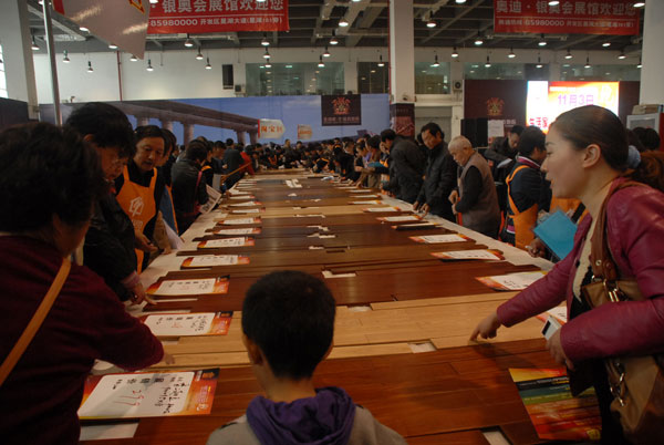 大唐盛世、烟雨江岸、雅典古城…,纯手工手刮实木地板的大面积出样让消费者充分感受到生活家地板作为仿古地板专利持有者以及行业标准起草者的产品品质。细心的消费者试图用随身带的钥匙刻划,样板完好无恙的漆面表现更让他们增加了信任。