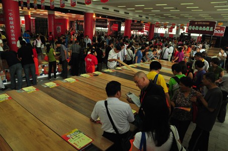 8月25日一早,南京玄武门规划馆的停车场已经没有了车位,涌动的人潮聚集在展销会入口领取礼品。在正式开展的10点前,工作人员已经很难用警戒线拦住急迫的参展人群,当继开场鼓后主持人宣布展销会开幕的一刻,人流如潮水般涌入了各个产品展区。高端区、精品区、特价区、59元销售区、零利润销售区吸引了不同销售预算的顾客;地热体验区、纯手工制作体验区、金钥匙服务无尘安装区、钻晶耐磨体验区、绿精灵环保治理区让所有参观选购的顾客全方位了解到生活家·巴洛克地板的品牌实力。整场展销会突出一个"抢"字活动主题。地板要抢,因为厂价直销全年最低、因为有些特价地板限量销售;辅料抵金券要抢,因为每户只有一张;订单送的家具要抢,因为样品现货只有这么多;订单奖品要抢,因为要看运气好坏,能不能抽到自己。11点左右,展销会现场达到高潮,收银台前排起长长的队伍。至下午1点半,付款排队始终不断并需要维持秩序。